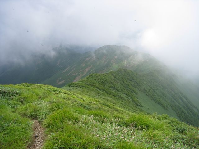 この山は先日登った同じ谷川連峰の平標山と違い、木道がないので野道をひたすら登り、山頂付近は岩肌を四つん這い!