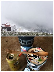 とても山頂で昼食を食べれる状況ではなかったので、昨日で営業を終えた肩の小屋で休憩🍜(休憩所は一年中使用可)
